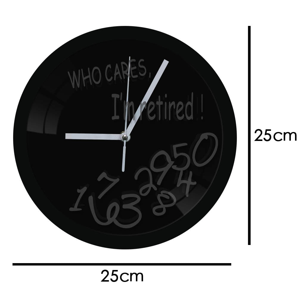 - Ainutlaatuinen ja humoristinen muotoilu: "WHO CARES, I'M RETIRED!" -teksti ja hajallaan olevat numerot juhlistavat eläkeläiselämän vapautta.