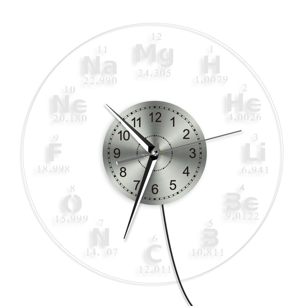 Tämä ainutlaatuinen seinäkello yhdistää funktionaalisuuden ja koulutuksellisen arvon näyttäväksi taideteokseksi. Jokainen tunti on merkitty alkuaineella jaksollisesta järjestelmästä, täydennettynä sen atomiluvulla ja -painolla – aina vety (H) klo 1:stä magnesiumiin (Mg) klo 12:een. Kirkas, energiatehokas LED-valaistus heittää pehmeän, lumoavan hehkun ympärilleen, tehden siitä täydellisen yövalon tai tunnelman luojan. Unohda ärsyttävät tikitykset; kellon hiljainen kvartsikoneisto varmistaa rauhallisen ympäristön opiskeluun, työhön tai rentoutumiseen. Se on enemmän kuin kello; se on päivittäinen muistutus tieteen ihmeistä ja tyylikäs tapa pitää aikaa silmällä. Kuvittele se laboratorion seinällä, opiskelijahuoneen piristyksenä tai modernin olohuoneen rohkeana ja opettavaisena yksityiskohtana!
