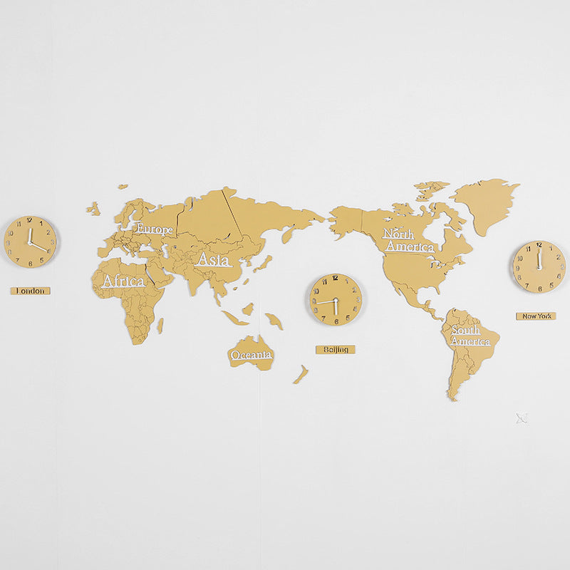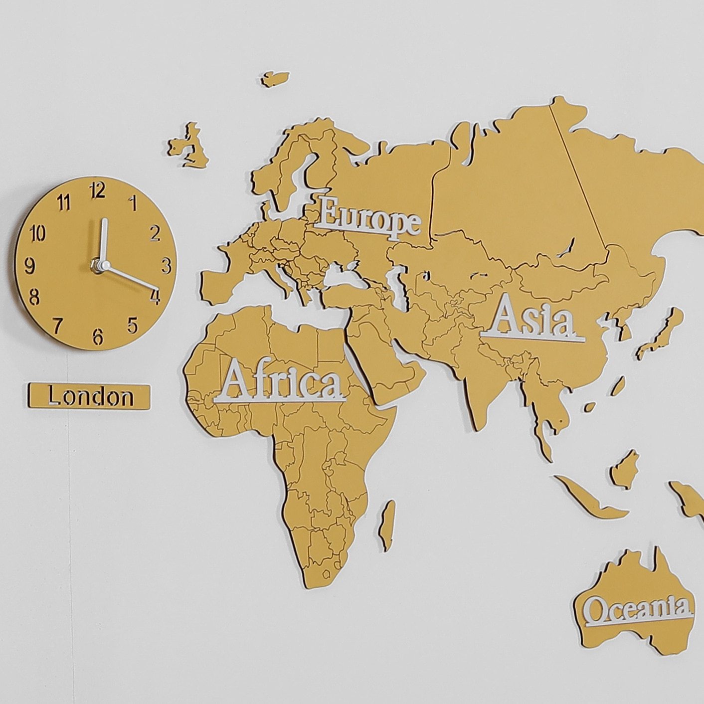 Tämä hienostunut maailmankartta-kello on valmistettu yksityiskohtia kunnioittaen, ja siinä on erilliset maanosat lämpimän kutsuvassa sinapinkeltaisessa sävyssä. Maanosien nimet, kuten "Europe", "Asia" ja "Africa", on tyylikkäästi valkoisella, mikä antaa sille hienostuneen ilmeen. Integroitu kello, joka näyttää ajan Lontoosta, tarjoaa sekä käytännöllisyyttä että ripauksen globaalia yhteyttä. Sen monikerroksinen muotoilu luo kauniin 3D-efektin seinällesi, tehden siitä keskipisteen missä tahansa modernissa tai skandinaavishenkisessä olohuoneessa. Kestävistä materiaaleista valmistettu tuote on suunniteltu kestämään ja ihastuttamaan vuosikausia.