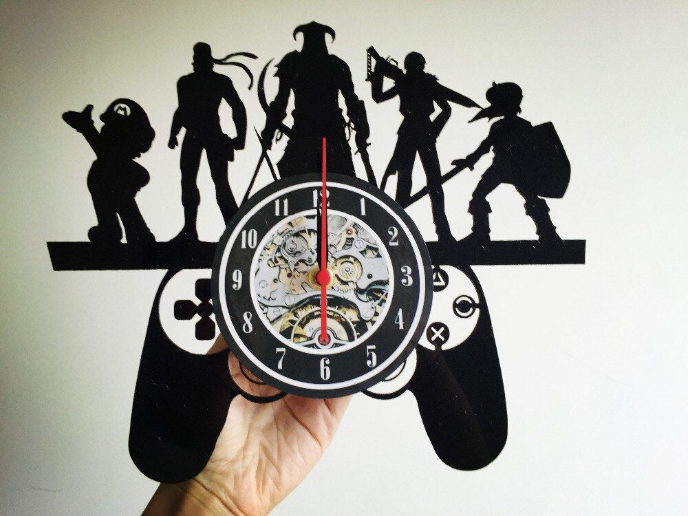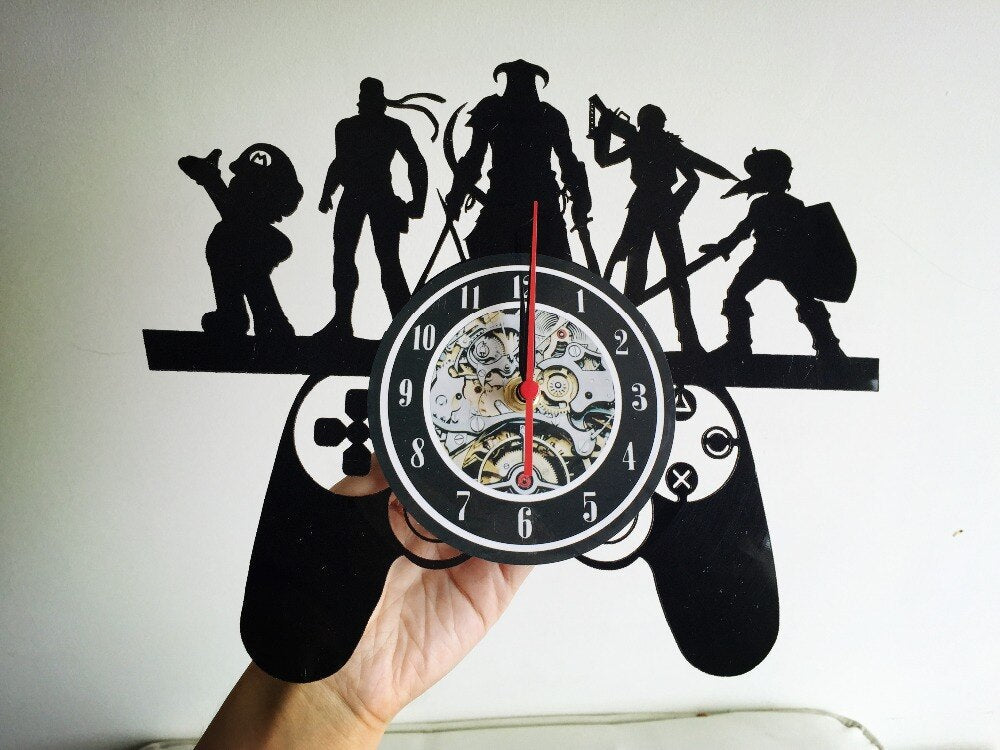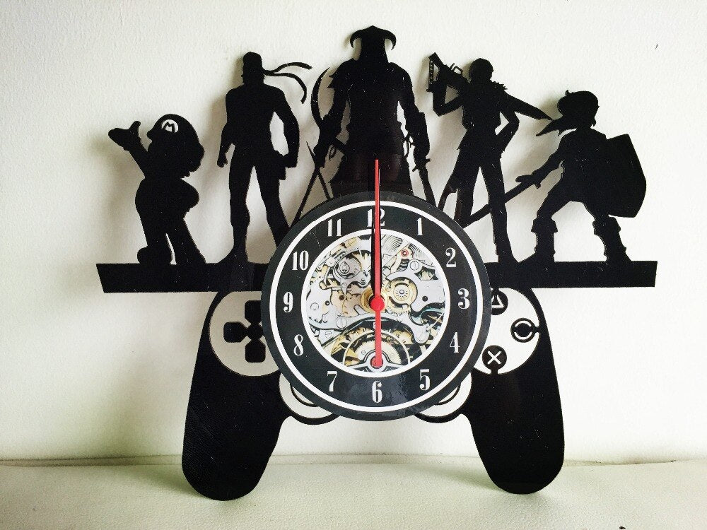 Tämä kello erottuu massasta sen ainutlaatuisen muotoilun ansiosta. Se on valmistettu kierrätetystä vinyylilevystä, mikä tekee jokaisesta kappaleesta ekologisen valinnan ja antaa sille autenttisen, retro-tuntuman. Peliohjaimen siluetti, täydellisenä D-padilla ja toimintonäppäimillä (kolmio, ympyrä, risti, neliö), luo tunnistettavan ja rakastetun ulkoasun. Sen yläpuolella olevat, tarkasti leikatut hahmosiluetit edustavat pelimaailman ikoneja, herättäen muistoja lukemattomista seikkailuista ja voitoista. Kellomekanismi on hiljainen, joten se ei häiritse pelisessioitasi tai rentoutumishetkiäsi. Se on mestarillinen yhdistelmä käytännöllisyyttä, nostalgiaa ja nykyaikaista pelaajaidentiteettiä.