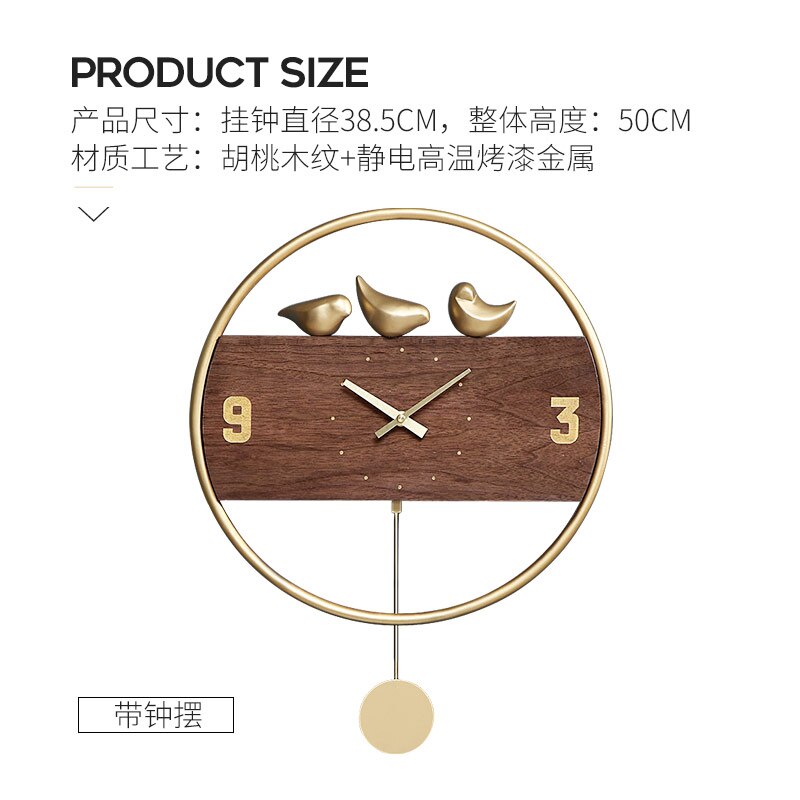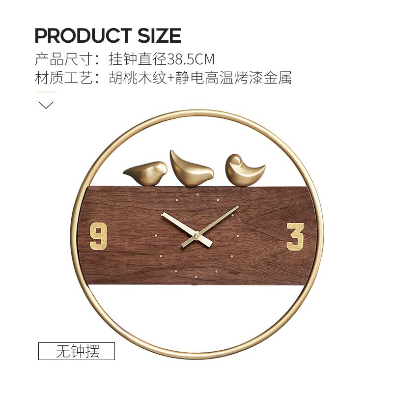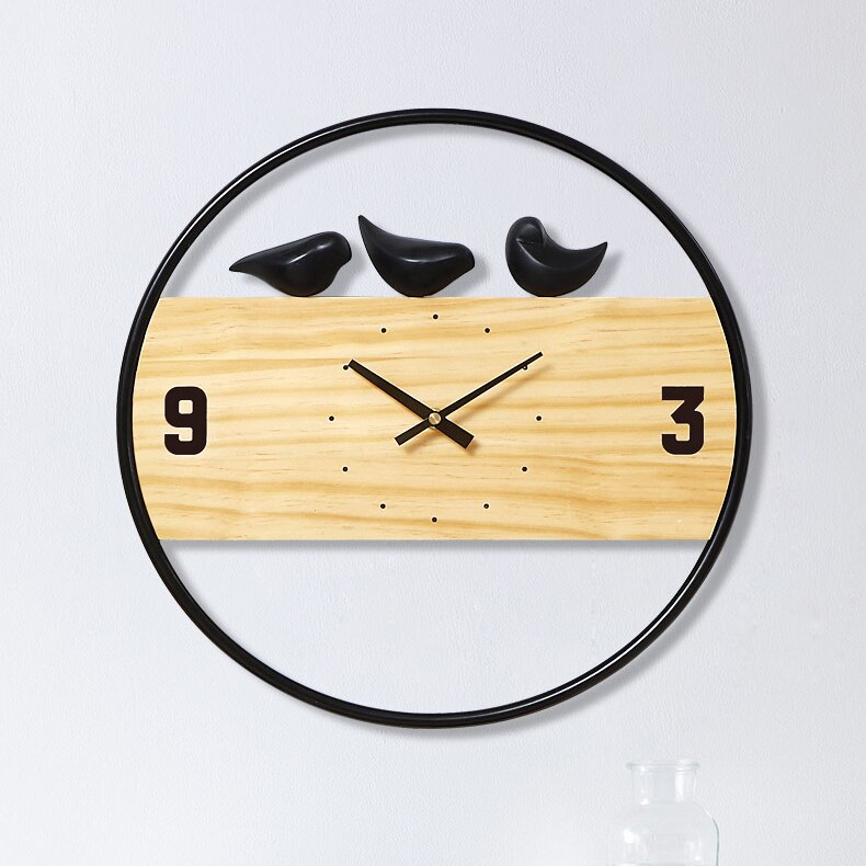 - Laadukkaat materiaalit: Kestävä puinen kellotaulu ja tyylikkäät mustat metalliset linnukoristeet.