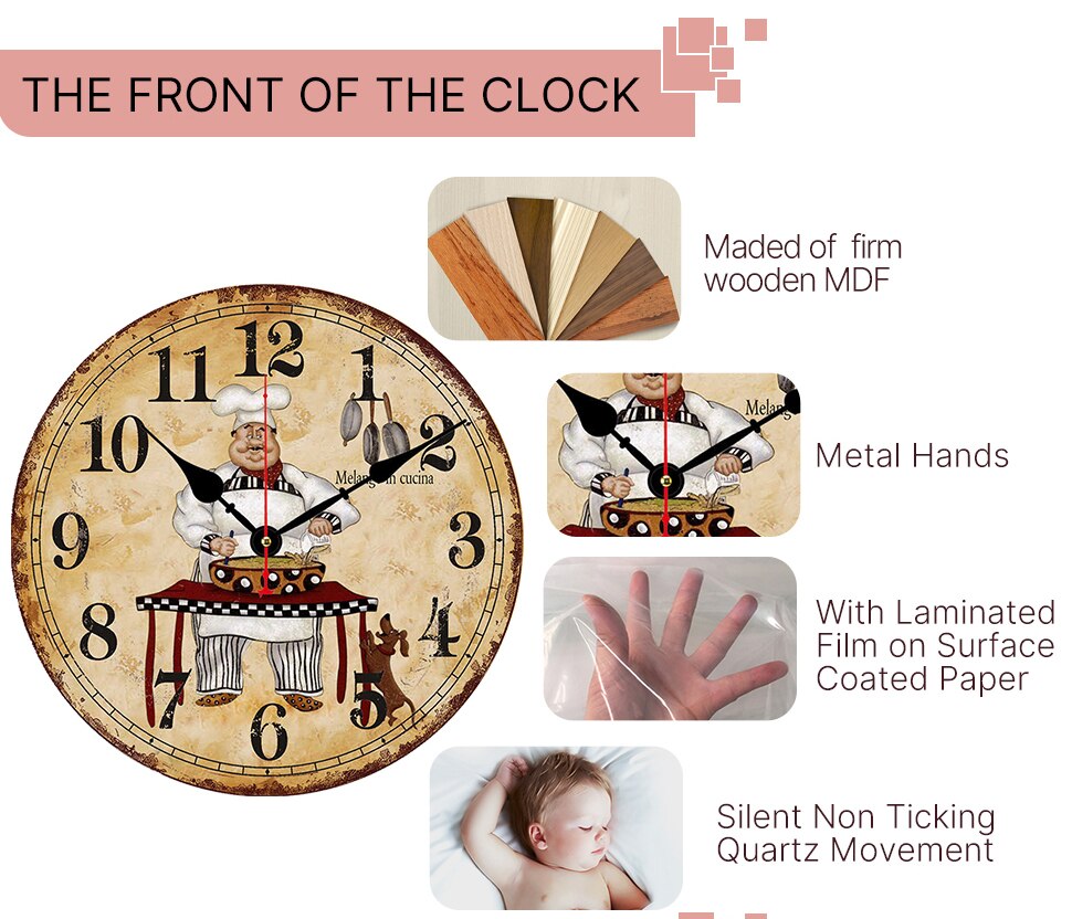 Koe eleganssi ja toiminnallisuus Retro-tyylinen värikäs puinen seinäkello -tuotteessamme. Suunniteltu kaunistamaan kotiasi ja pitämään ajan tyylikkäästi näkyvissä, se yhdistää hienostuneen muotoilun ja käytännöllisyyden.