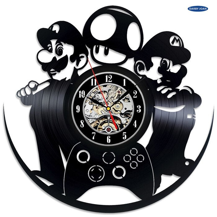 - **Käsityönä tehty uniikki muotoilu:** Jokainen kello on tarkkaan laserleikattu aidosta vinyylilevystä, esitellen yksityiskohtaisia Super Mario -hahmoja ja peliohjaimen siluetteja.
